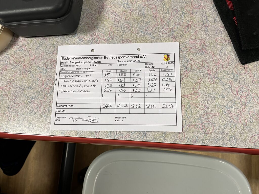 Heute mit der SG Stern in Tübingen. Wir waren wie immer gut drauf und lautstark dabei. 4 Spiele. 757 Pins.