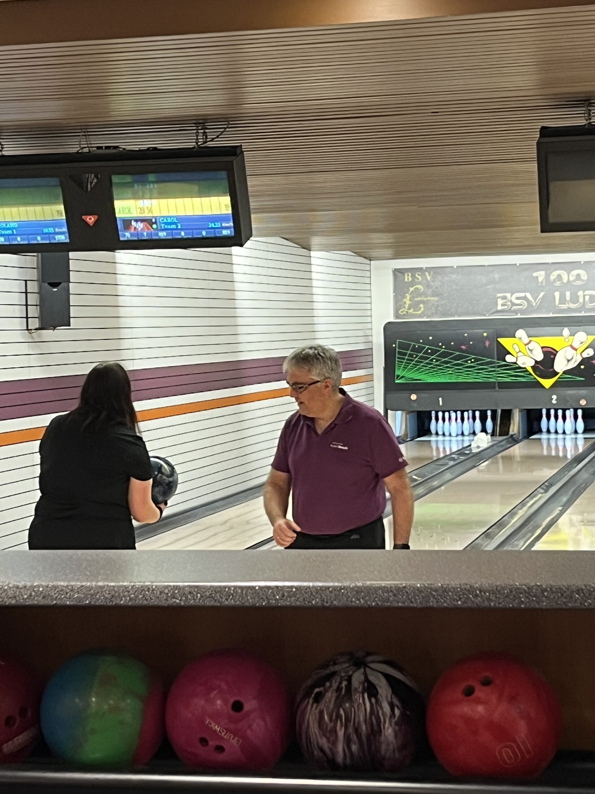 Bisher hatte ich meine Armhaltung beim Start immer leicht vor dem Körper – das fühlte sich stabil an, aber irgendwie auch etwas angespannt. Thilo hat mir gezeigt, dass der rechte Arm besser seitlich neben dem Körper startet, während die linke Hand unter der rechten Hand stützt. Dadurch bleibt das Pendel deutlich lockerer und natürlicher. Alternativ könnte ich die Ballposition auch beibehalten, dann müsste ich allerdings meine Hüfte schon im Stand aus der Bahn bringen indem ich einen Fuß weiter nach hinten stelle, was sich noch komischer anfühlt 😛