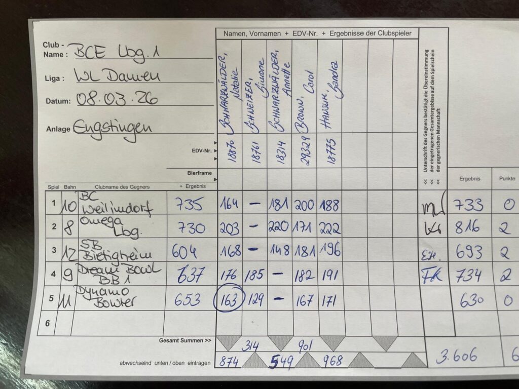 Als Mannschaft haben wir heute wirklich großartig gespielt. Mit einem Mannschaftsspiel von 816 Pins haben wir das höchste Teamergebnis des Tages gestellt. Insgesamt bleiben wir damit weiterhin auf Platz 2 der Gesamttabelle, mit 2 Punkten hinter Platz 1. Beim letzten Ligastart heißt das also ganz klar: noch einmal alles reinwerfen und schauen, was möglich ist.