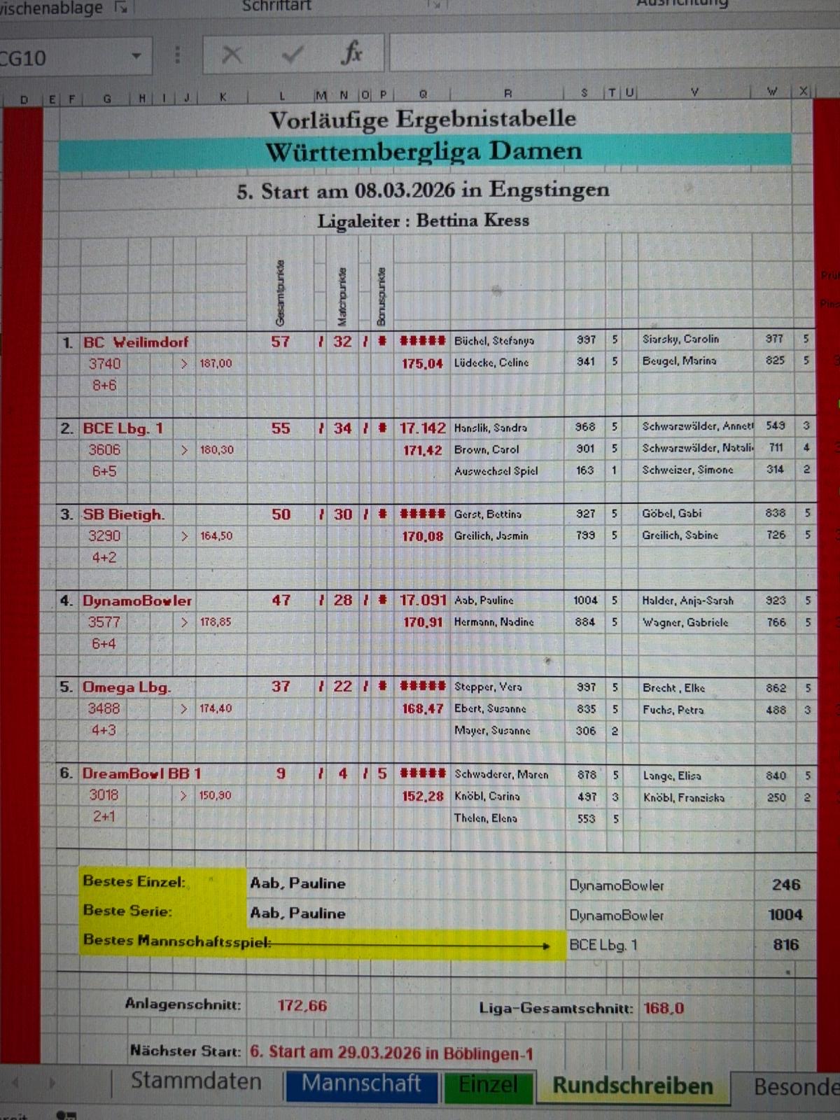 Als Mannschaft haben wir heute wirklich großartig gespielt. Mit einem Mannschaftsspiel von 816 Pins haben wir das höchste Teamergebnis des Tages gestellt. Insgesamt bleiben wir damit weiterhin auf Platz 2 der Gesamttabelle, mit 2 Punkten hinter Platz 1. Beim letzten Ligastart heißt das also ganz klar: noch einmal alles reinwerfen und schauen, was möglich ist.